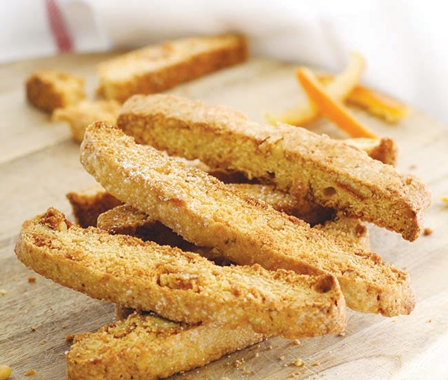 Slice the logs on the diagonal to about ¾ inch thick. Lay them on their sides and bake for 8-10 minutes or until dry.