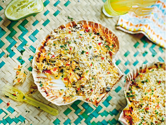 6. Remove from the heat and stir in the crabmeat, mustard, lime juice and coriander and season with salt and pepper. If it’s too dry, add a little more coconut milk. Spoon into 4 lightly oiled ramekins or clean scallop shells.