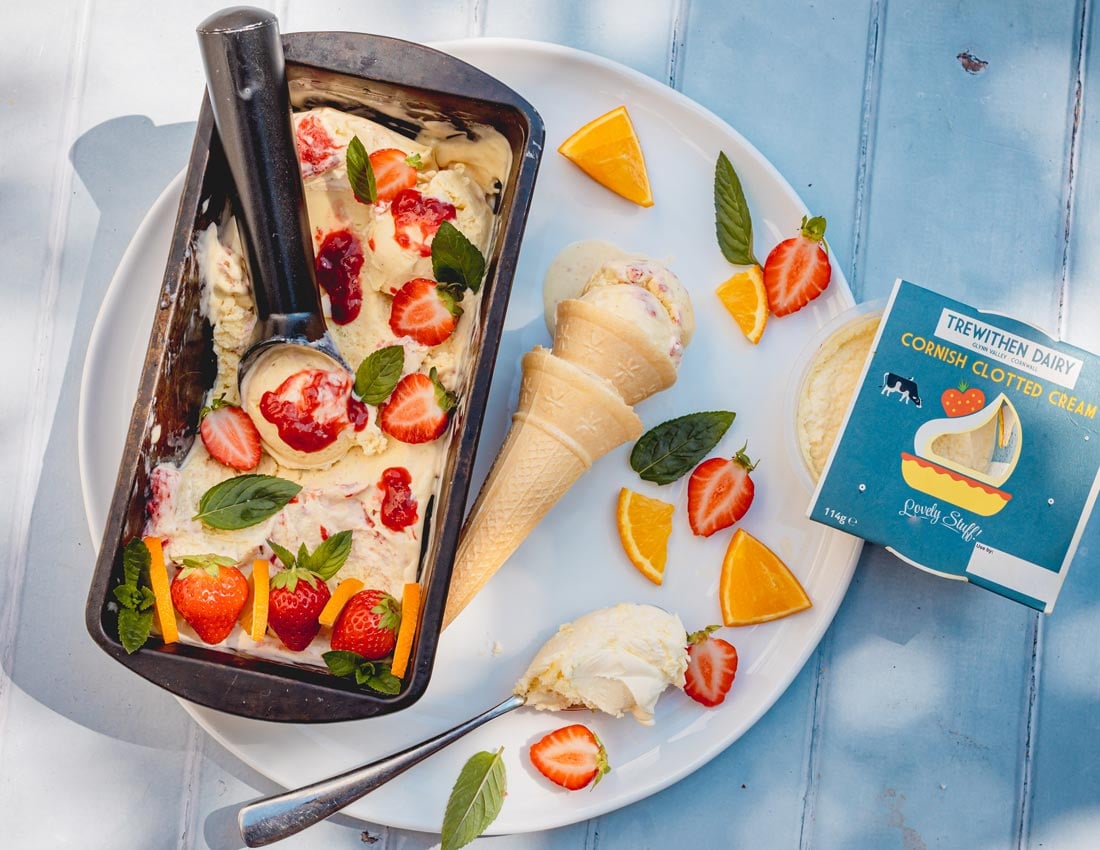 To serve: remove the clotted cream ice cream from the freezer and add fresh strawberries, mint and orange slices to garnish. Enjoy in cones or bowls.