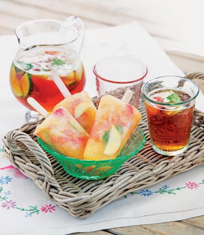 Divide the strawberries, apple slices, and mint leaves among six popsicle moulds. Pour over the Pimm’s mixture and insert the popsicle sticks.
