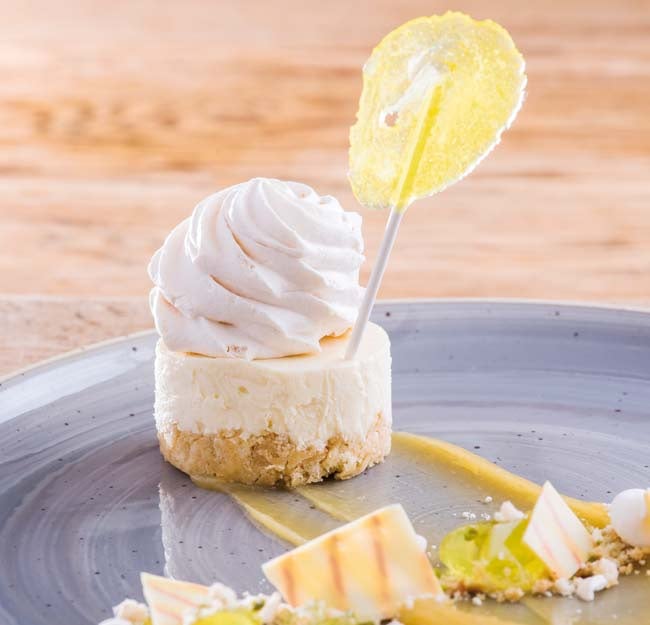 6. To assemble: place meringue on top of the turned-out cheesecake, decorate the plate with a swipe of lemon curd and place the cheesecake on top. Serve with a lemon lollipop.