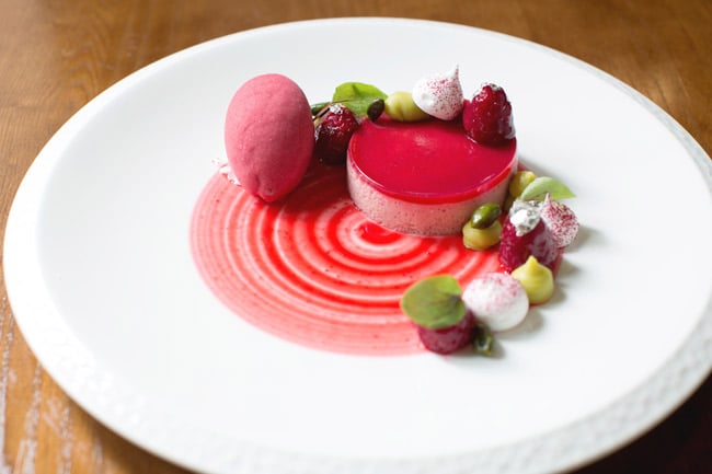 Scott Paton shares his recipe for raspberry mousse with raspberry sorbet and pistachio cream