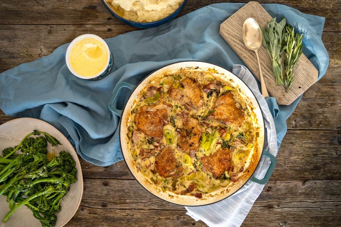 5. Serve the baked chicken thighs with side dishes such as celeriac and potato mash with more Rodda’s Cornish clotted cream stirred through and buttered purple sprouting broccoli.
