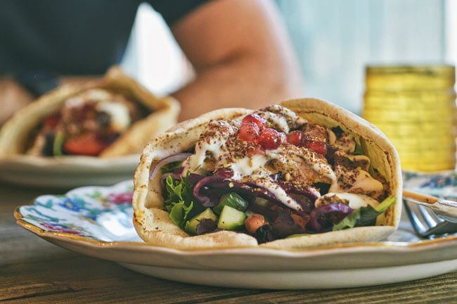 4. Put a warmed flatbread on a plate, layer with the mixed leaves, tomato, cucumber, onion and cabbage. Slice the cooked chicken into strips and add to the flatbread with a handful of pomegranate seeds and a sprinkle of za’atar. Finish with a drizzle of the yogurt dressing.