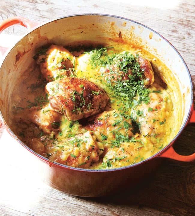 1. Preheat the oven to 180°c/gas 4. Choose a flameproof casserole dish or a wide ovenproof pan that will hold the chicken pieces snugly but comfortably.