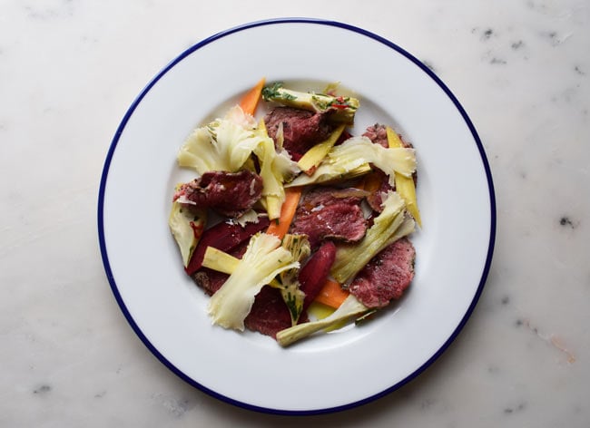 7. To serve, slice the lamb into thin discs, then, with the flat side of a heavy knife, push the meat out so it’s  very thin.