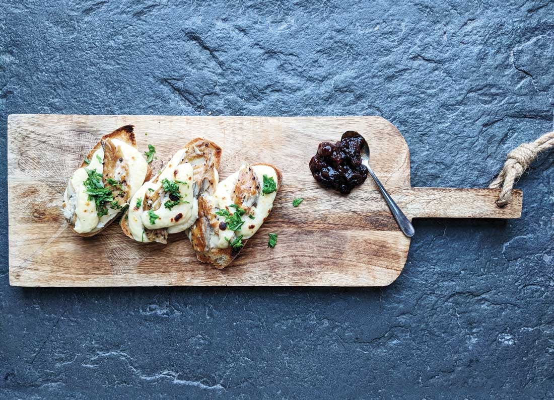 5. Garnish the smoked mackerel rarebit with rocket and your choice of chutney.
