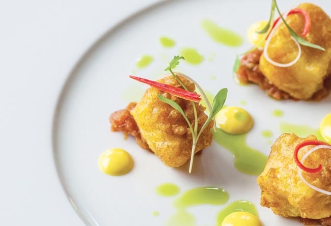 A light as air batter, combined with zingy hits of tomato and curry adds wow factor to this monkfish dish from The Bath Priory’s head chef