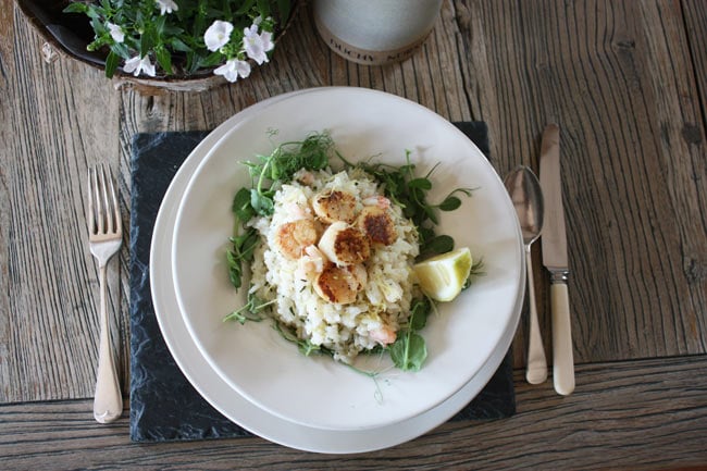 Seared scallops with prawn risotto