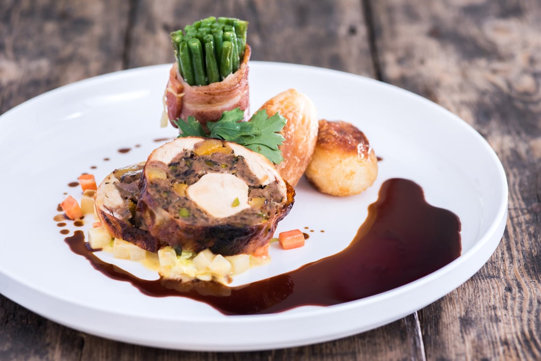 Pistachio, apricot and prune stuffed poussins