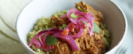 ‘This is our bestselling dish at Wahaca and one of my favourite recipes from Mexico. It comes from the Yucatán and uses two local products: achiote, a spicy paste made from the ground red berries of the annatto tree, which turns the marinade brick red; and the habañero chilli, which gives it a lovely touch of fire,’ says Thomasina Miers