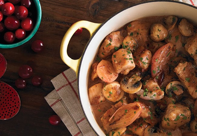 2. Stir in the shallots and mushrooms and brown lightly. Add the cider and cranberry sauce, bring to the boil then simmer, covered for 40 minutes.