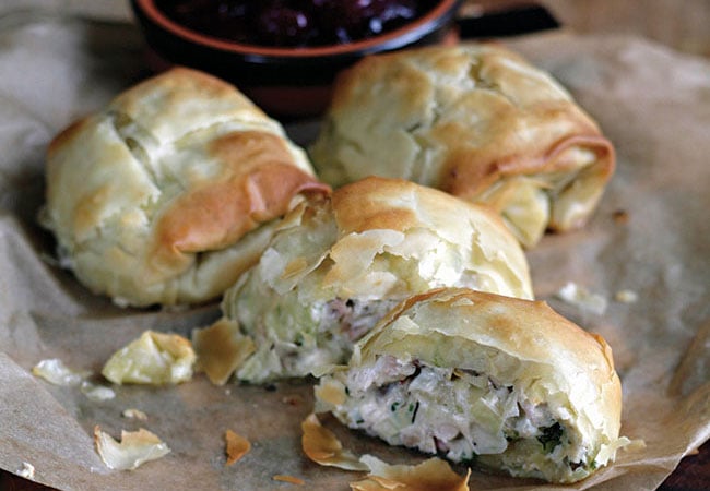 4. Lay out one sheet of filo pastry and brush with melted butter (keep the remaining filo pastry covered with a clean damp tea towel to prevent it from drying out). Repeat with two more filo pastry sheets. Cut the filo pastry sheets into three, lengthways, spoon a heaped tbsp of the turkey mixture along the short edge of the pastry, 1cm from the edge. Fold the bottom edge over the filling, tuck in the sides and roll into a tight cylinder.