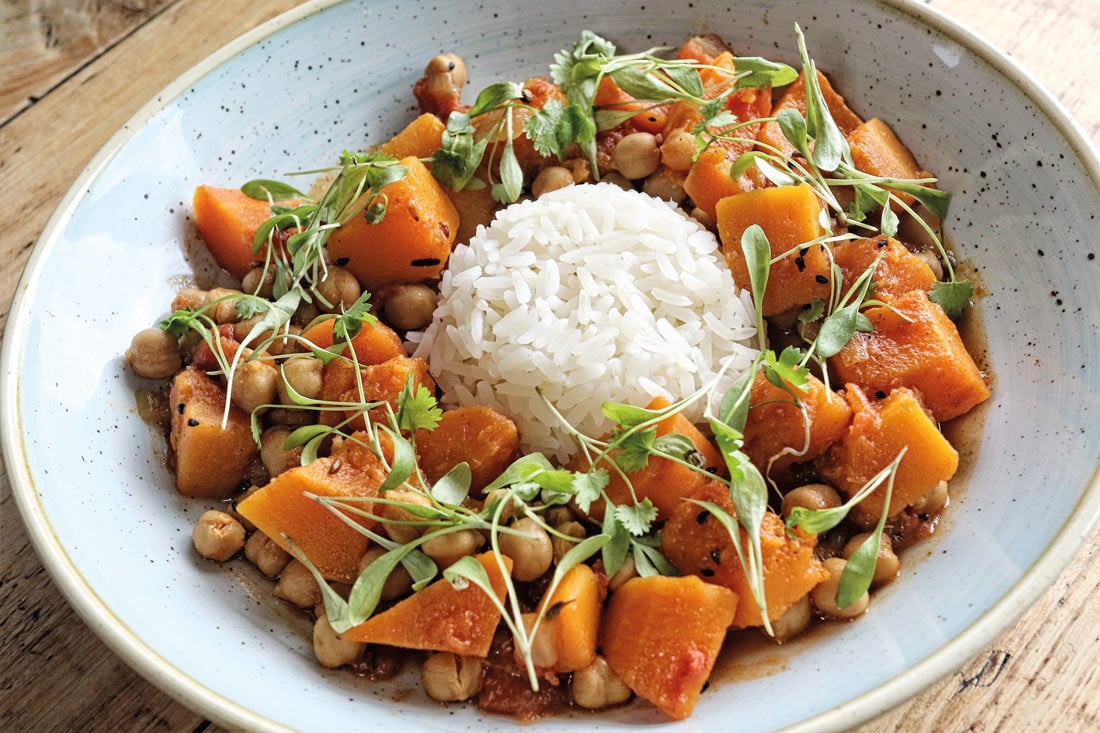 Chris Morris, head chef at The Kitchen at The Donkey Sanctuary in Sidmouth, shares his African inspired butternut squash and chickpea stew with long grain rice and micro coriander recipe