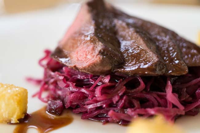 Lapsang souchong tea adds a unique flavour to this venison hanch dish served with red cabbage and sautéed potato from James Nathan of St Enodoc Hotel in Cornwall