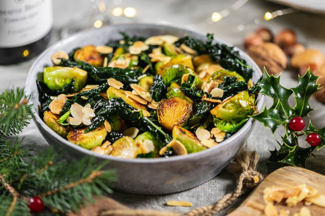 3. Keep the sprouts on the heat and let them cook for a few more minutes, until starting colour on the edges. Remove from the heat and stir in the kale. Taste and adjust the seasoning with salt and pepper. Serve topped with the toasted almonds.