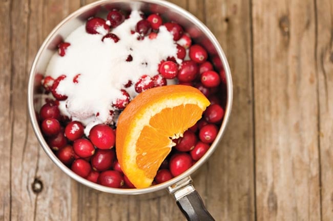 1. Mince the cranberries in a food processor (or using a potato ricer) and place into a saucepan with the orange juice, sugar, a few slivers of orange zest, cinnamon stick and cloves.