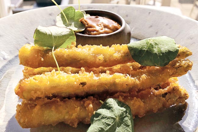 Tempura asparagus with black garlic dipping sauce