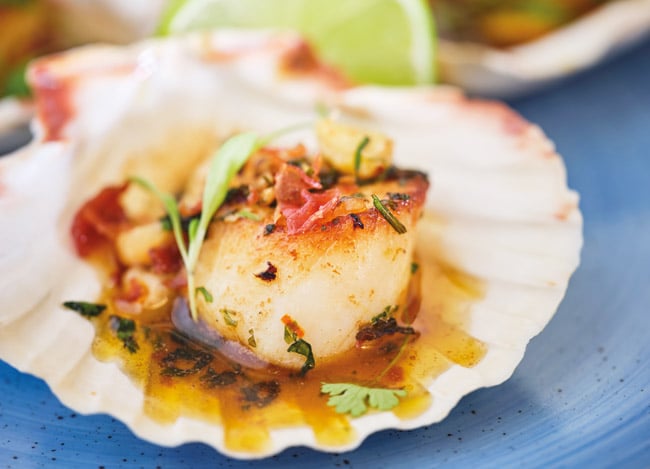 Pan-seared Cornish scallops with chilli, lime and coriander butter